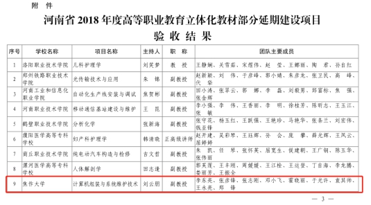 按照河南省教育厅《关于公布 2018 年度高职院校立体化教材立项名单的通知》(教高〔2018〕869 号),我校教师刘云朋及其团队的《计算机组装与系统维护技术》获省级立项建设,目前该项目已通过评审验收,请项目团队根据文件要求做好后期建设工作。