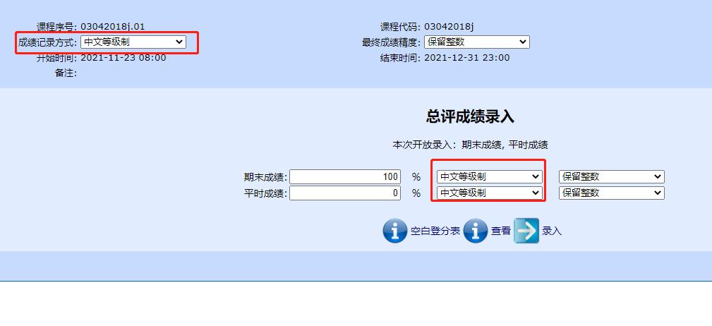 4.注意录入时期末成绩和平时成绩的记录方式和总评成绩的记录方式保持一致,如下图红框标注所示。