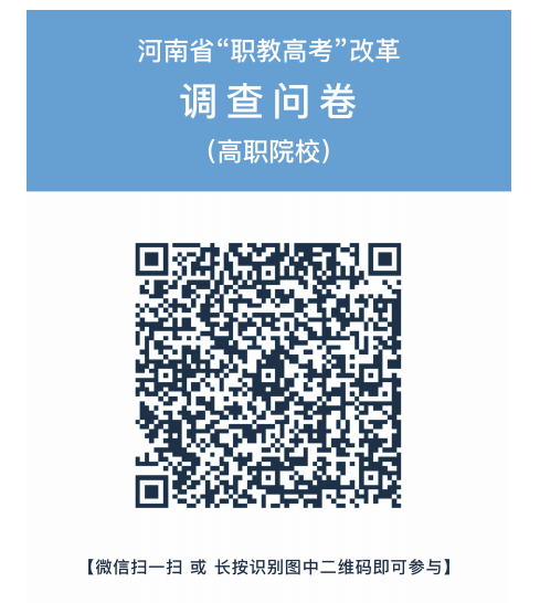 根据河南省教育厅办公室《关于开展“职教高考”改革问卷调查的通知》文件精神,为贯彻落实全国、全省职业教育大会精神,深入推进职业教育创新发展高地建设,加快建立符合技术技能人才选拔培养规律的“职教高考”制度,根据工作需要,现开展有关调查问卷工作,请招办、规划处及各个学院师生代表填写问卷(扫下图二维码),其中每个院部不少于5份。