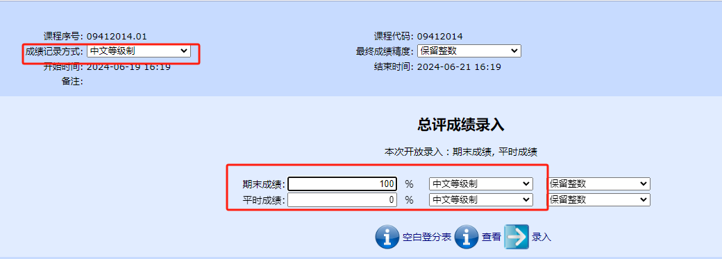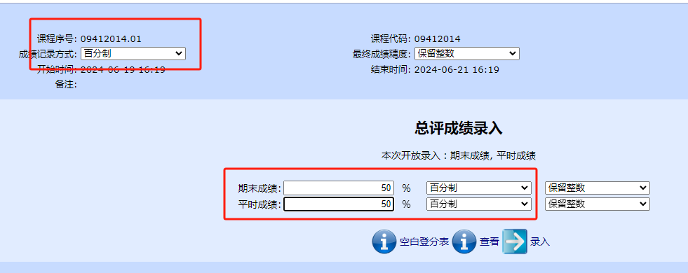 5.注意录入时期末成绩和平时成绩的记录方式和总评成绩的记录方式保持一致,如下图红框标注所示。