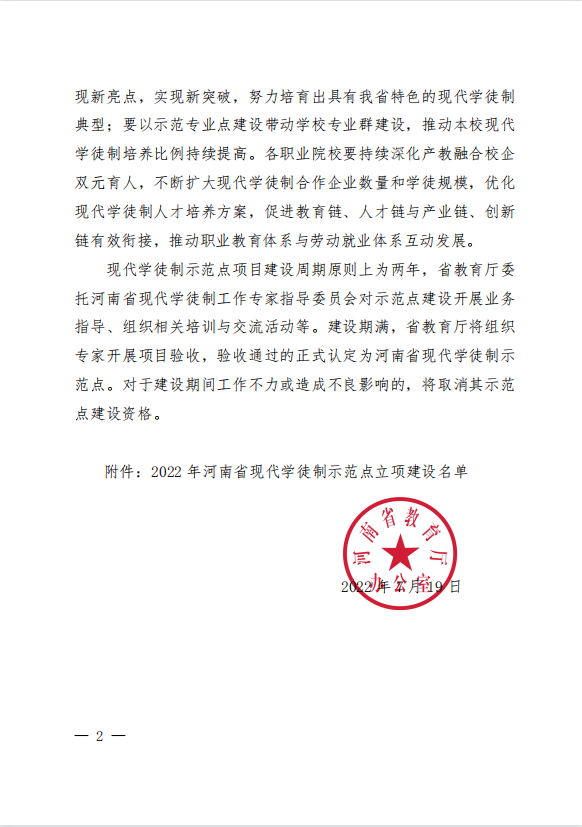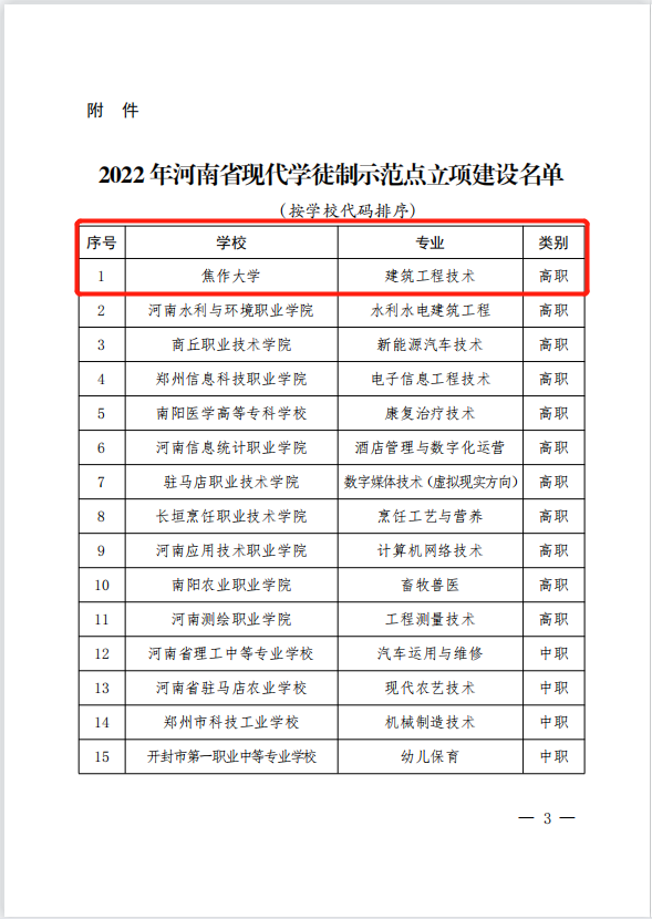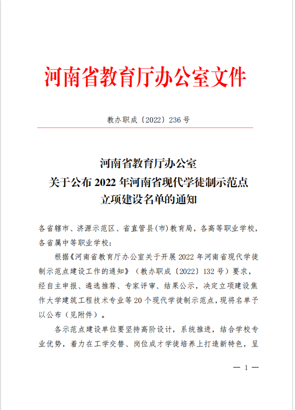 2022年河南省现代学徒制示范点立项建设名单的通知》(教办职成〔2022〕236号),我校土木建筑工程学院建筑工程技术专业被认定为河南省现代学徒制示范点立项建设项目。