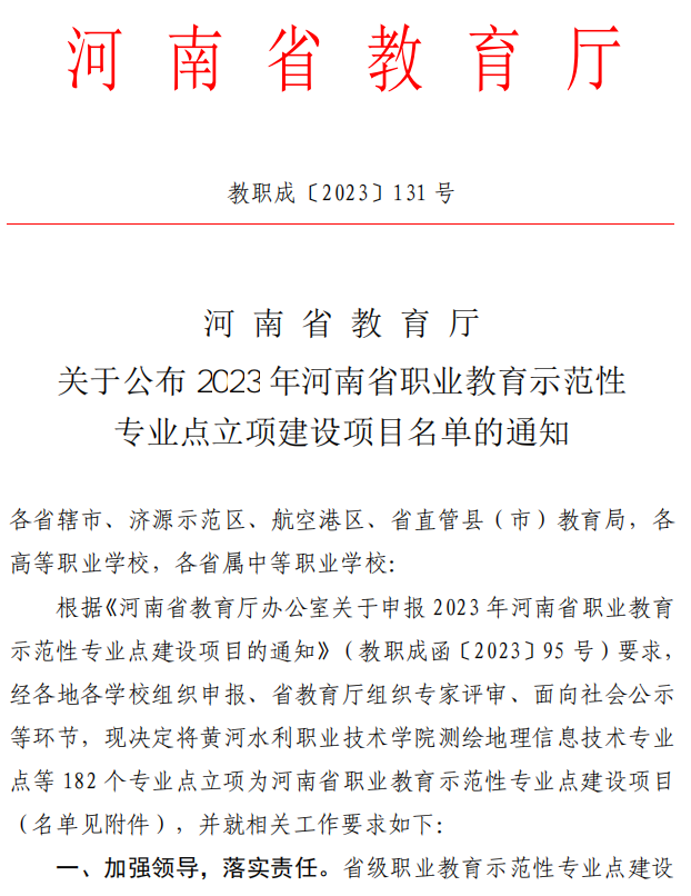 近日,河南省教育厅公布了《河南省教育厅关于2023年河南省职业教育示范性专业点建设项目立项项目名单的公示》的通知,yl23411永利(集团)有限公司官网申报的建筑工程技术获批示范性传统优势专业点,申报的机电一体化技术专业获批示范性骨干专业点。