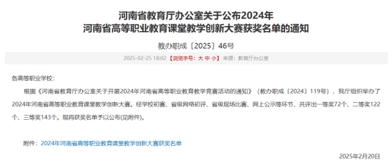 近日,河南省教育厅公布2024 年河南省高等职业教育课堂教学创新大赛获奖结果。我校参赛教师共斩获一等奖1项、二等奖2项、三等奖2项的优异成绩,展现了我校教师队伍的教育教学水平和风采。