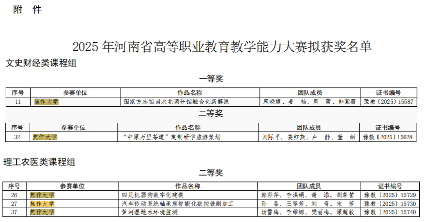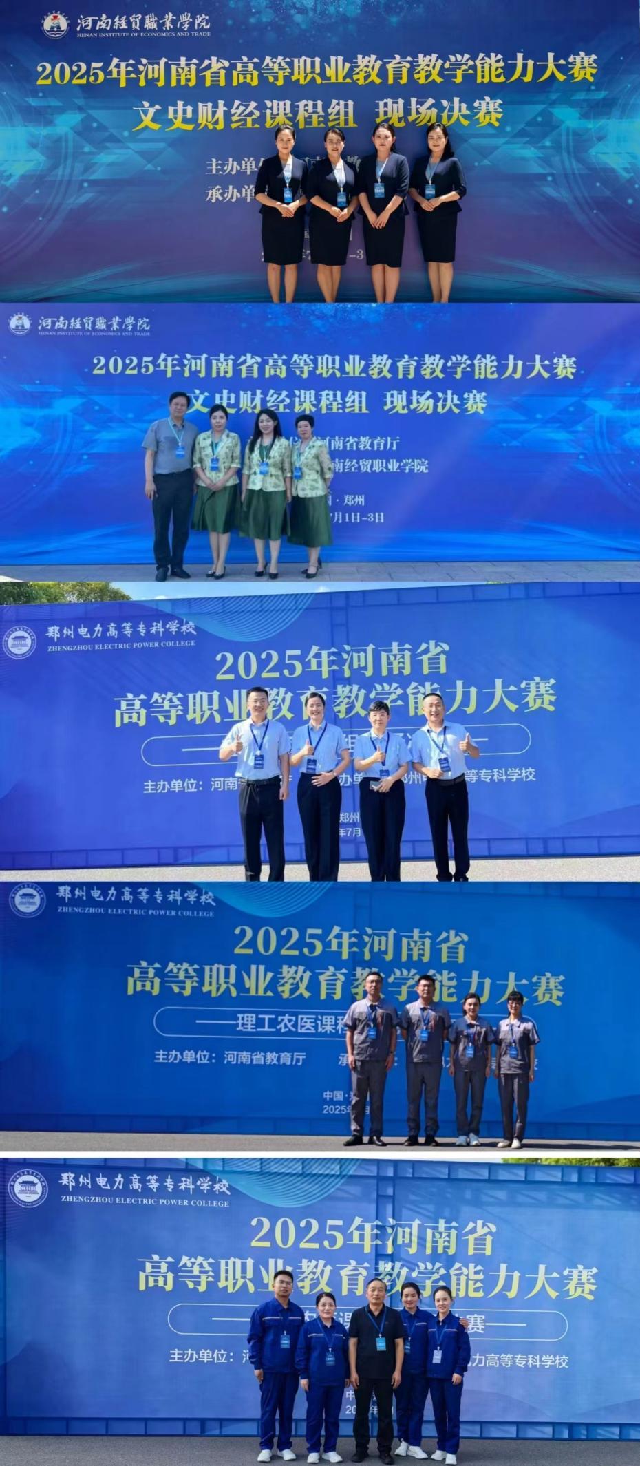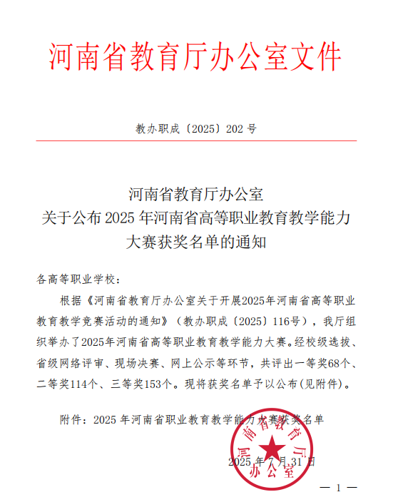 近日,河南省教育厅印发《河南省教育厅办公室关于公布2025年河南省高等职业教育教学能力大赛获奖名单的通知》(教办职成〔2025〕202 号),我校5支教师团队表现优异,斩获一等奖1项、二等奖4项,获奖数量与层次均创历史新高,为学校高质量发展注入强劲动力。