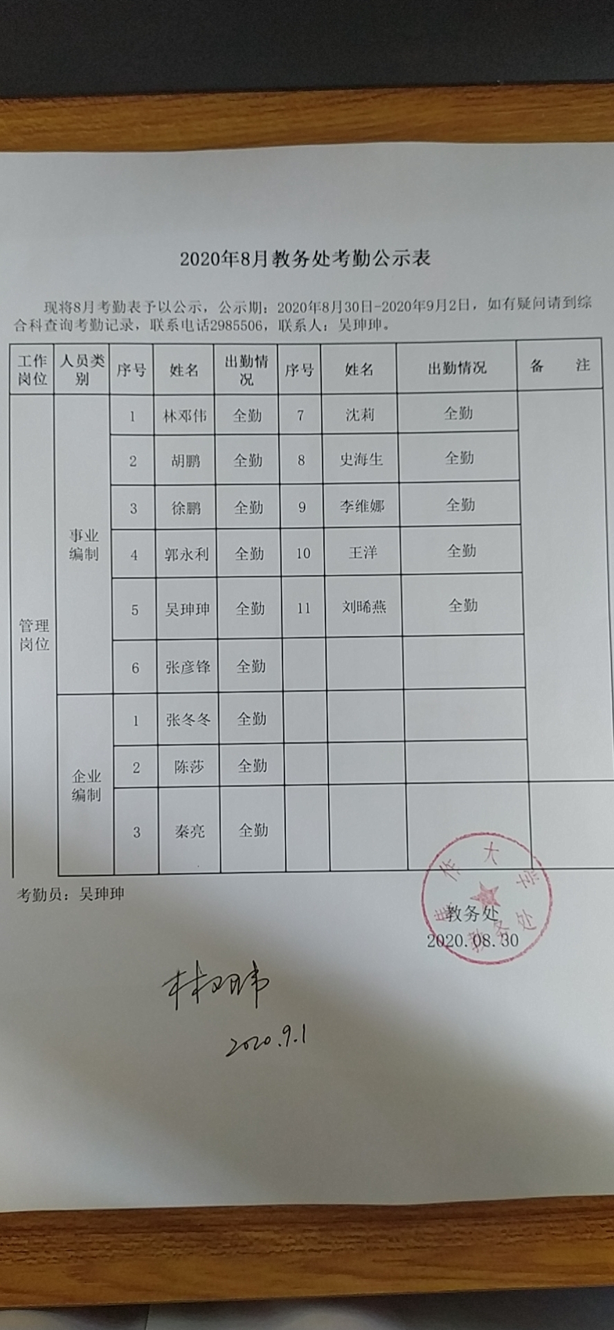2020年8月教务处考勤表公示