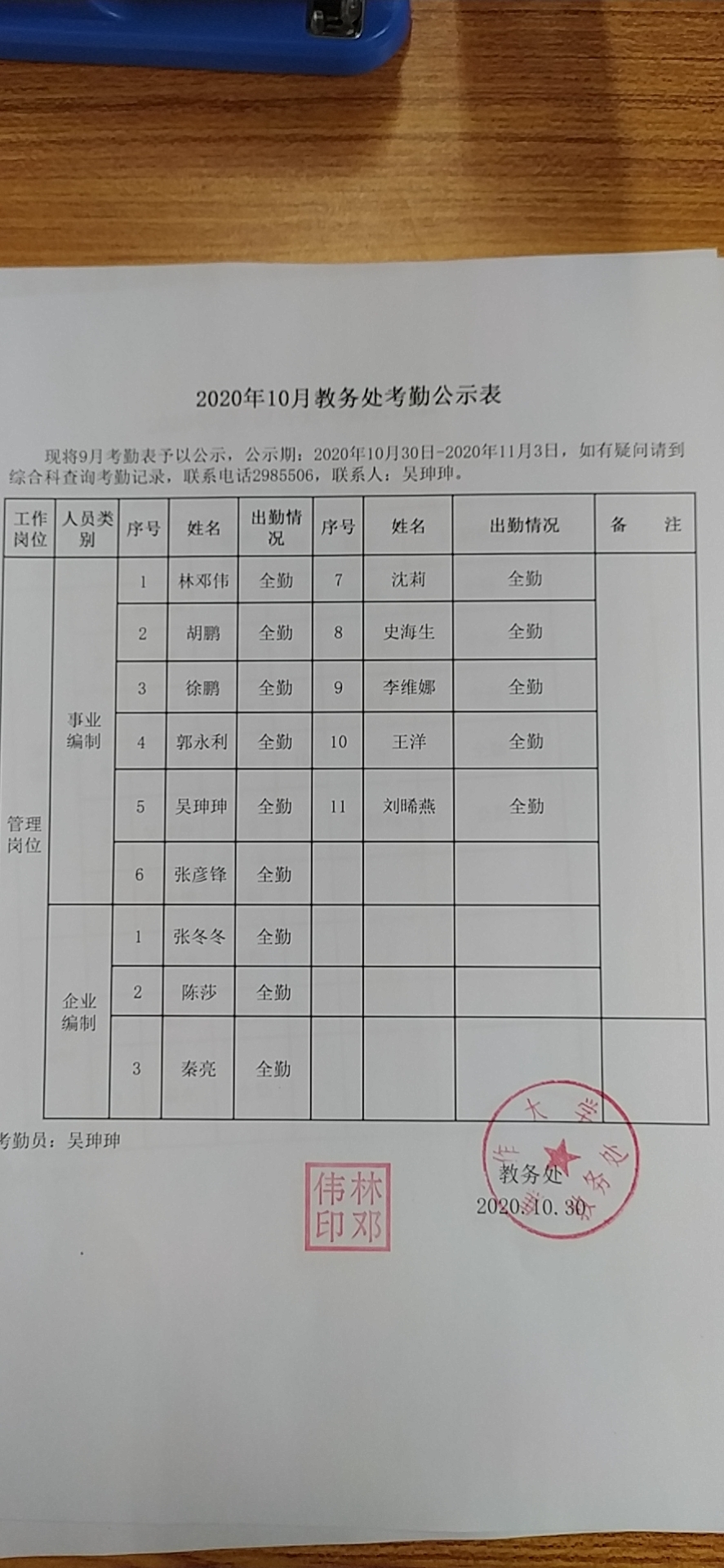 2020年10月教务处考勤表公示
