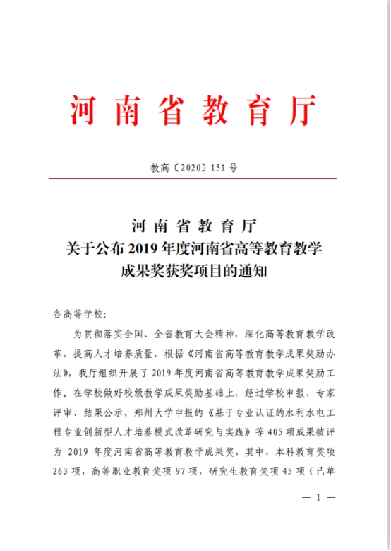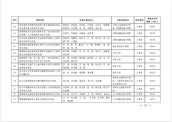 在 2019 年度河南省高等教育教学成果奖评比中,由我校教师范涛主持的《非物质文化遗产引入地方高校公共艺术教学课堂的途径探究》和杨光主持的《电子技术系列课程教学和高职院校创新人才培养问题研究》,分别荣获河南省高等教育教学成果奖二等奖,特此表彰,获奖具体名单如下: