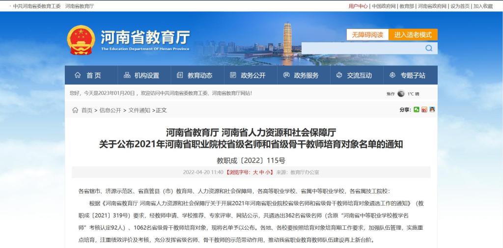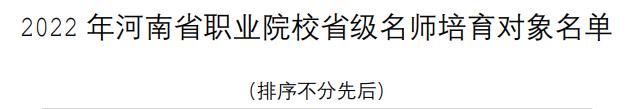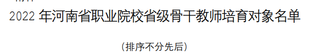 近日,河南省教育厅网站公示了由河南省教育厅、河南省人力资源和社会保障厅关于2022年河南省职业院校省级名师和省级骨干教师培育对象遴选结果。我校有六名教师入选为2022年河南省职业院校省级名师培育对象,十二名教师入选为2022年河南省职业院校省级骨干教师培育对象。